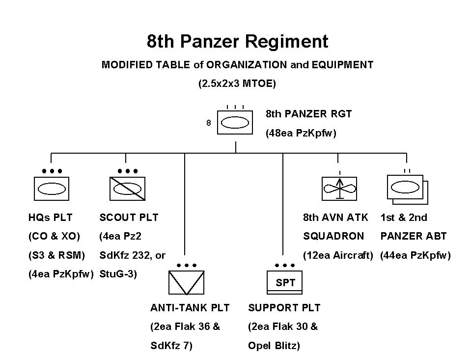 Originally consisting of a Regimental HQs Platoon (or in German terminology a Zug) and 2ea Panzer Abteilungen (or Battalions), the Regiment's Modified Table of Organization and Equipment or MTOE was later expanded to reflect the on-going changes to the game, and to provide the Regiment with the additional capabilities of a Scout (Reconnaisance) Platoon, an Anti-Tank Platoon, a Support (Logistics) Platoon, and an Aviation (Attack) Squadron.